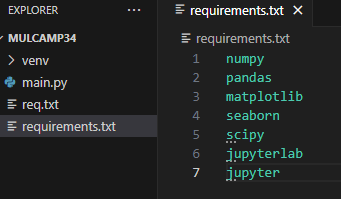 이번에는 requirements.txt 에 scipy, jupyterlab, jupyter 패키지를 추가하고 bash 터미널에 $ pip install -r requirements.txt 을 다시 실행해 설치한다. freeze를 통해서 패키지가 정상적으로 추가 설치되었음을 확인할 수 있다.