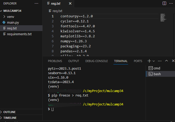 이때 pip freeze > req.txt 를 실행하면 새로운 목록을 기존 패키지 목록에 덮어씌울 수 있다.